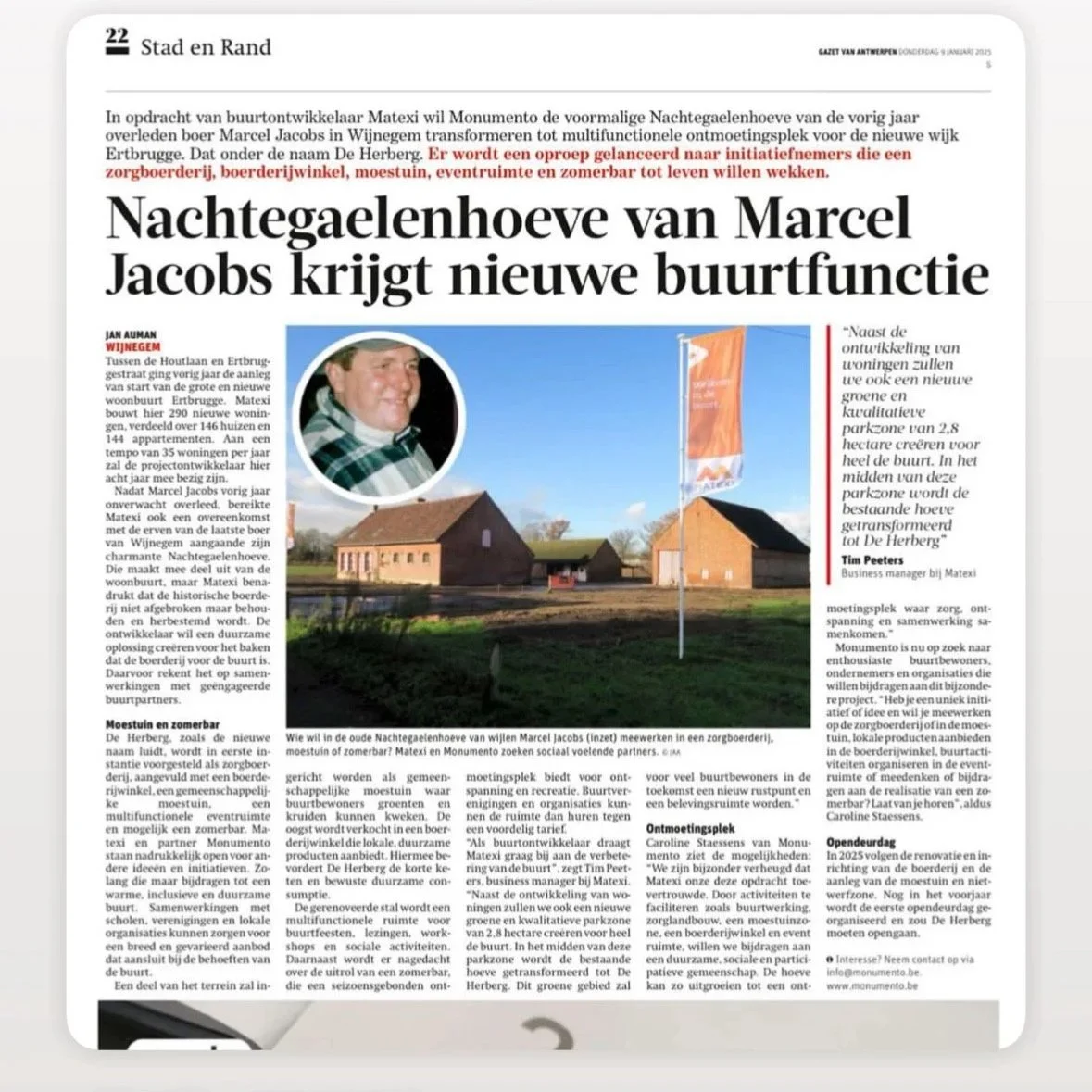 In opdracht van buurtontwikkelaar Matexi wil Monumento de voormalige Nachtegaelenhoeve van de vorig jaar overleden boer Marcel Jacobs in Wijnegem transformeren tot multifunctionele ontmoetingsplek voor de nieuwe wijk Ertbrugge. Dat onder de naam De Herberg. Er wordt een oproep gelanceerd naar initiatiefnemers die een zorgboerderij, boerderijwinkel, moestuin, eventruimte en zomerbar tot leven willen wekken.